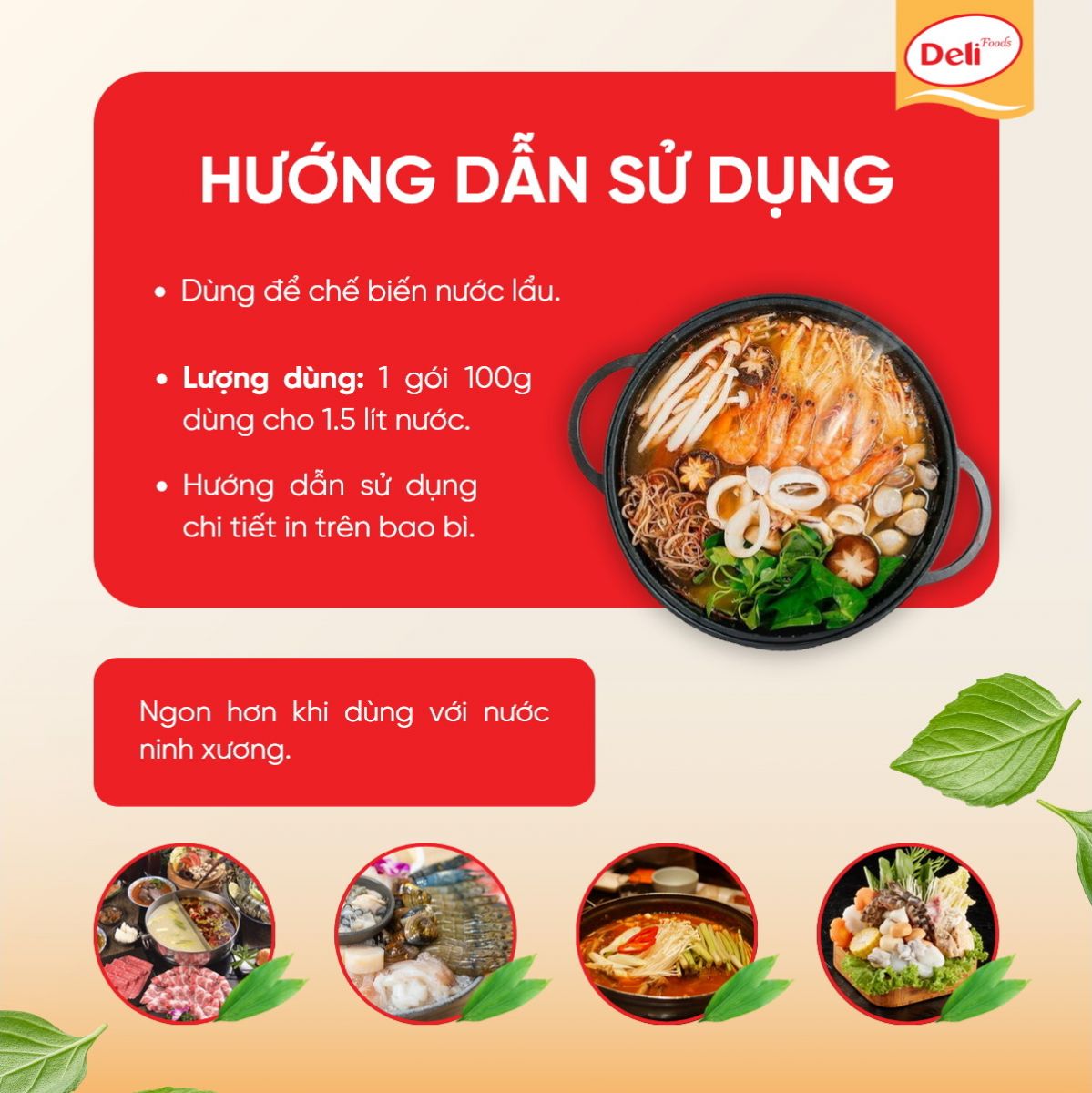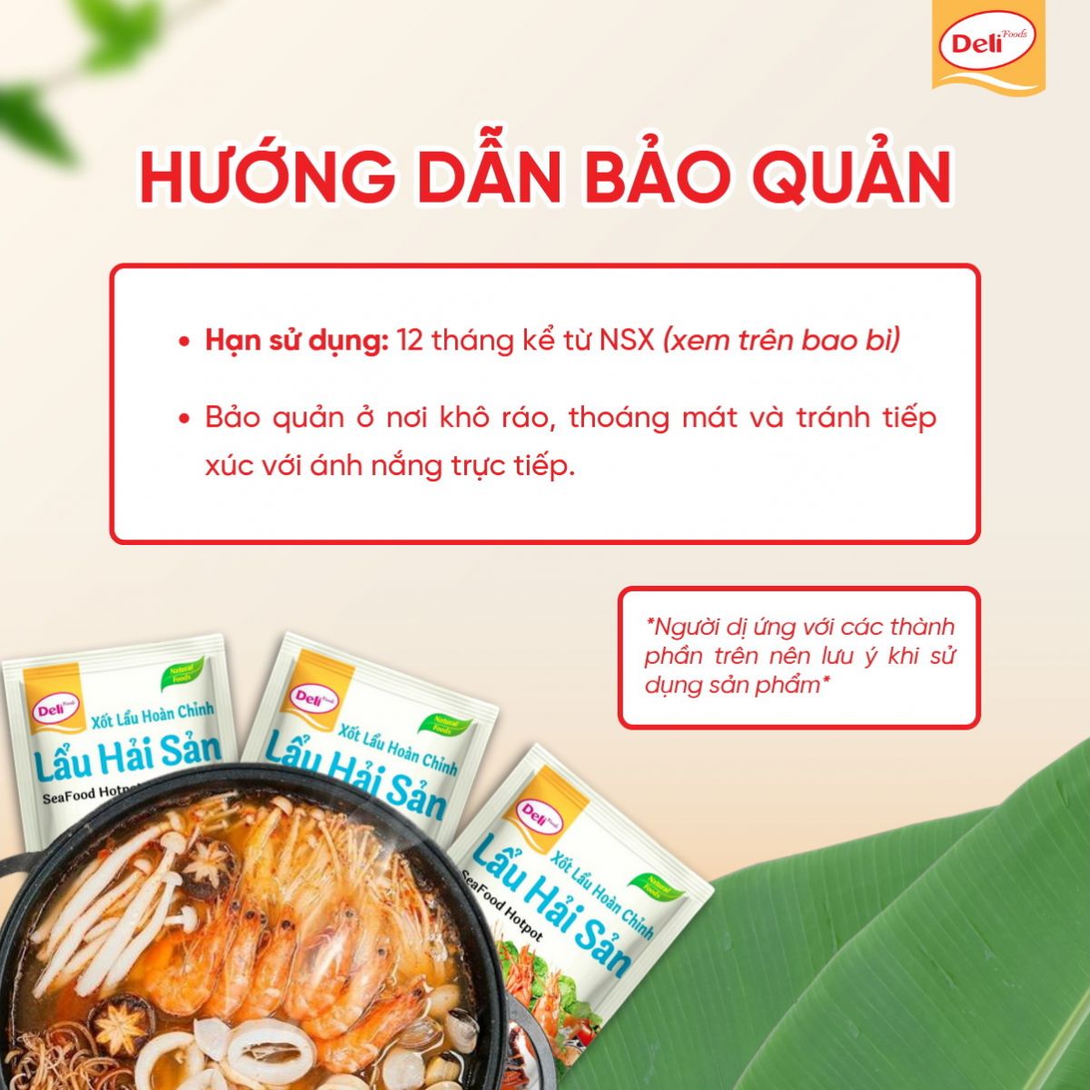 + Xốt lẩu hoàn chỉnh LẨU HẢI SẢN được dùng để chế biến nước lẩu với hương thơm tự nhiên, vị cay nhẹ (ngon ngọt hơn khi dùng với nước dùng ninh xương).