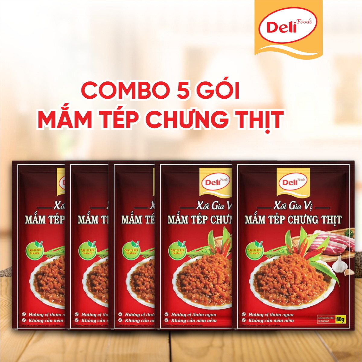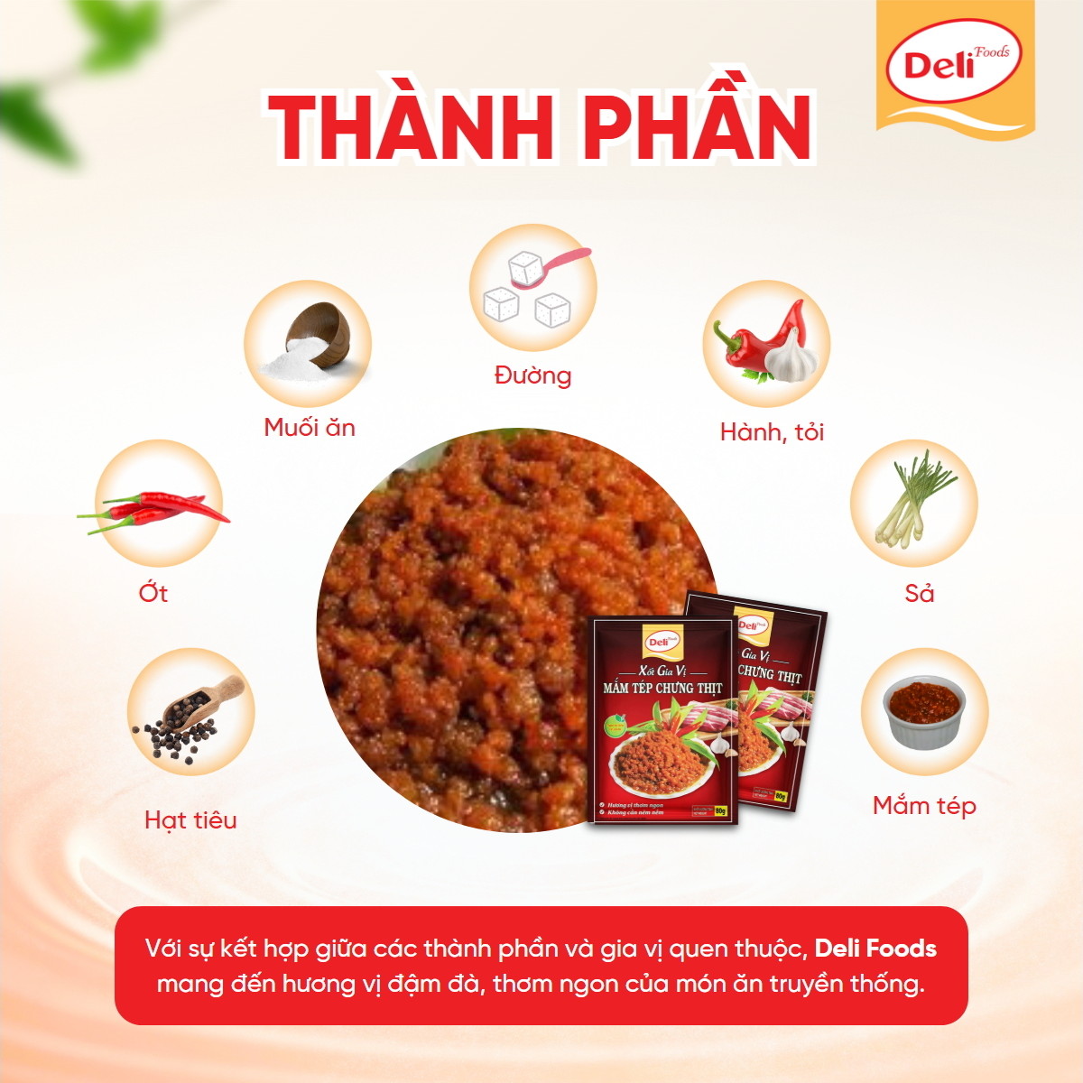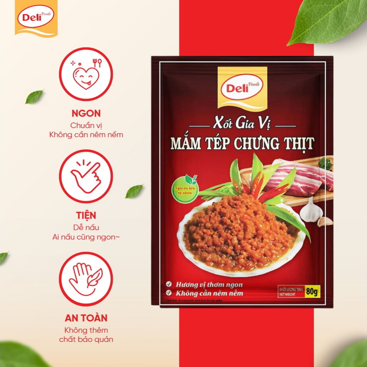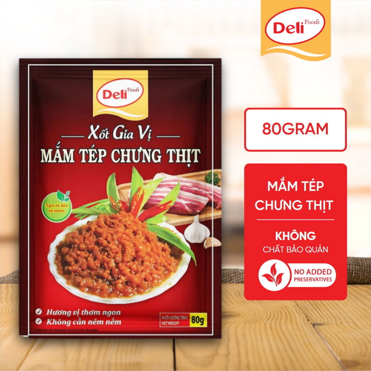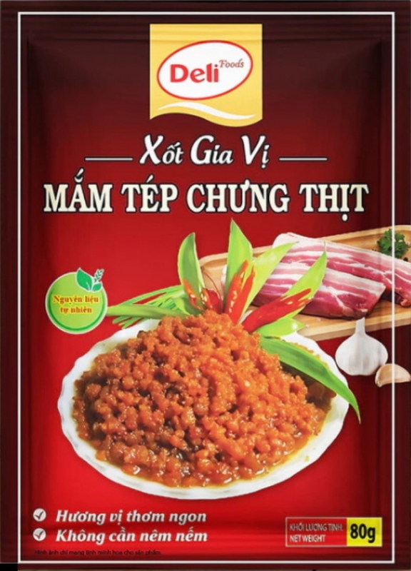- Dễ dàng sử dụng: Chỉ cần một gói Xốt gia vị mắm tép chưng thịt Deli Foods 80g, bạn đã có ngay một nồi mắm tép chưng thịt thơm ngon, chuẩn vị mà không cần tốn nhiều thời gian chuẩn bị.